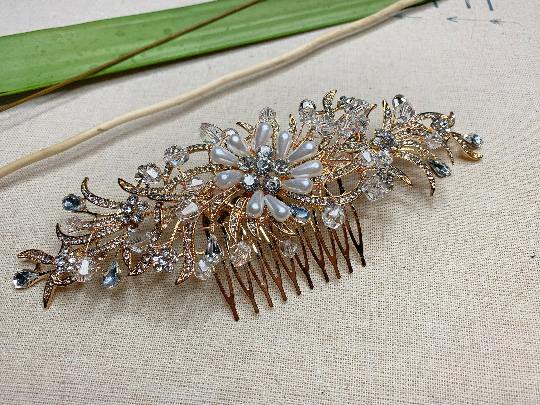 Gold wedding comb with pearls and rhinestones